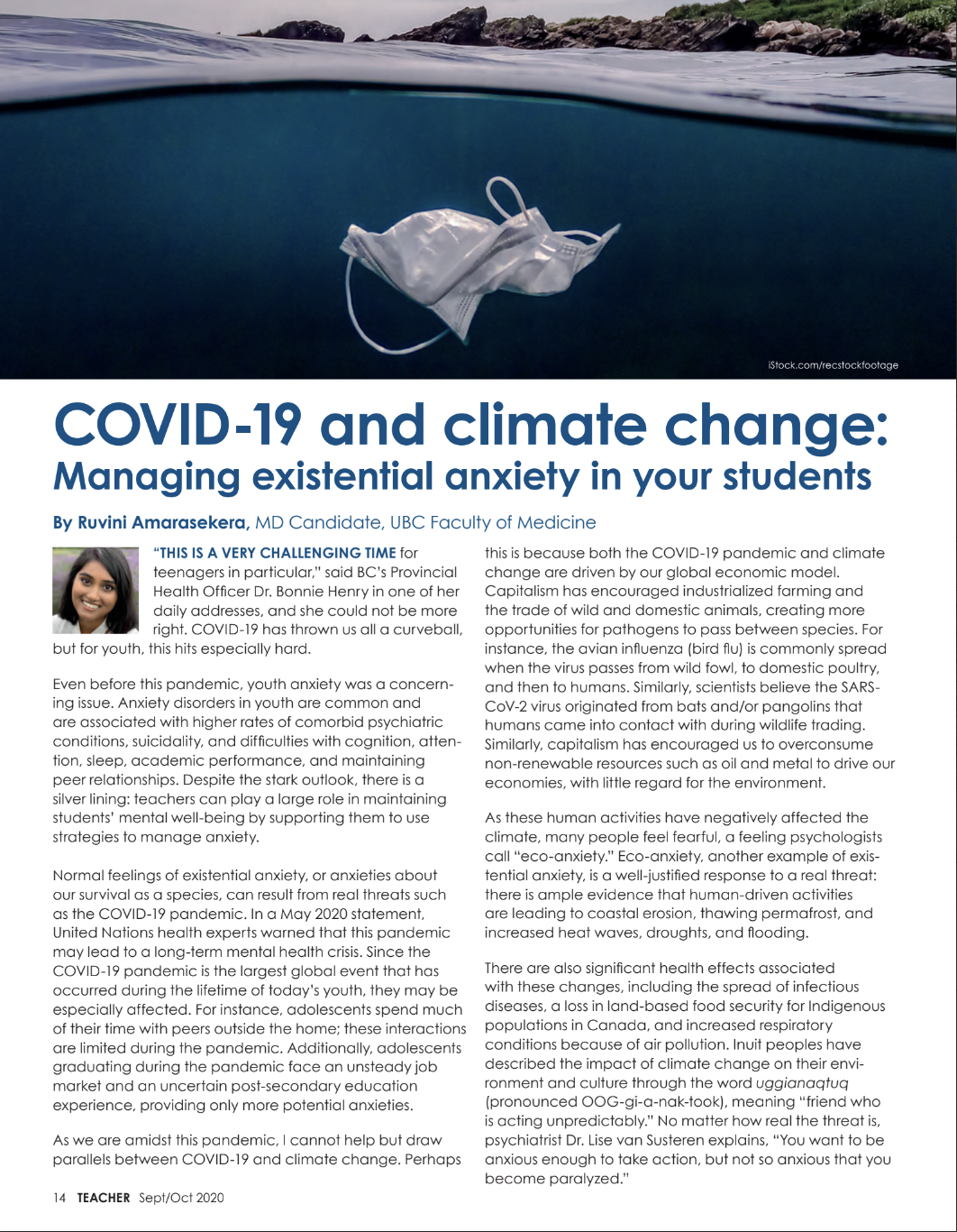 Medical Student, Ruvini Amarasekera, was in our mentorship program, researching the challenges facing teachers during this time when students are facing anxiety about climate change and the future. At the end of her term, she wrote the article COVID-19 and climate change: Managing existential anxiety in your students which was published in Teacher Magazine.