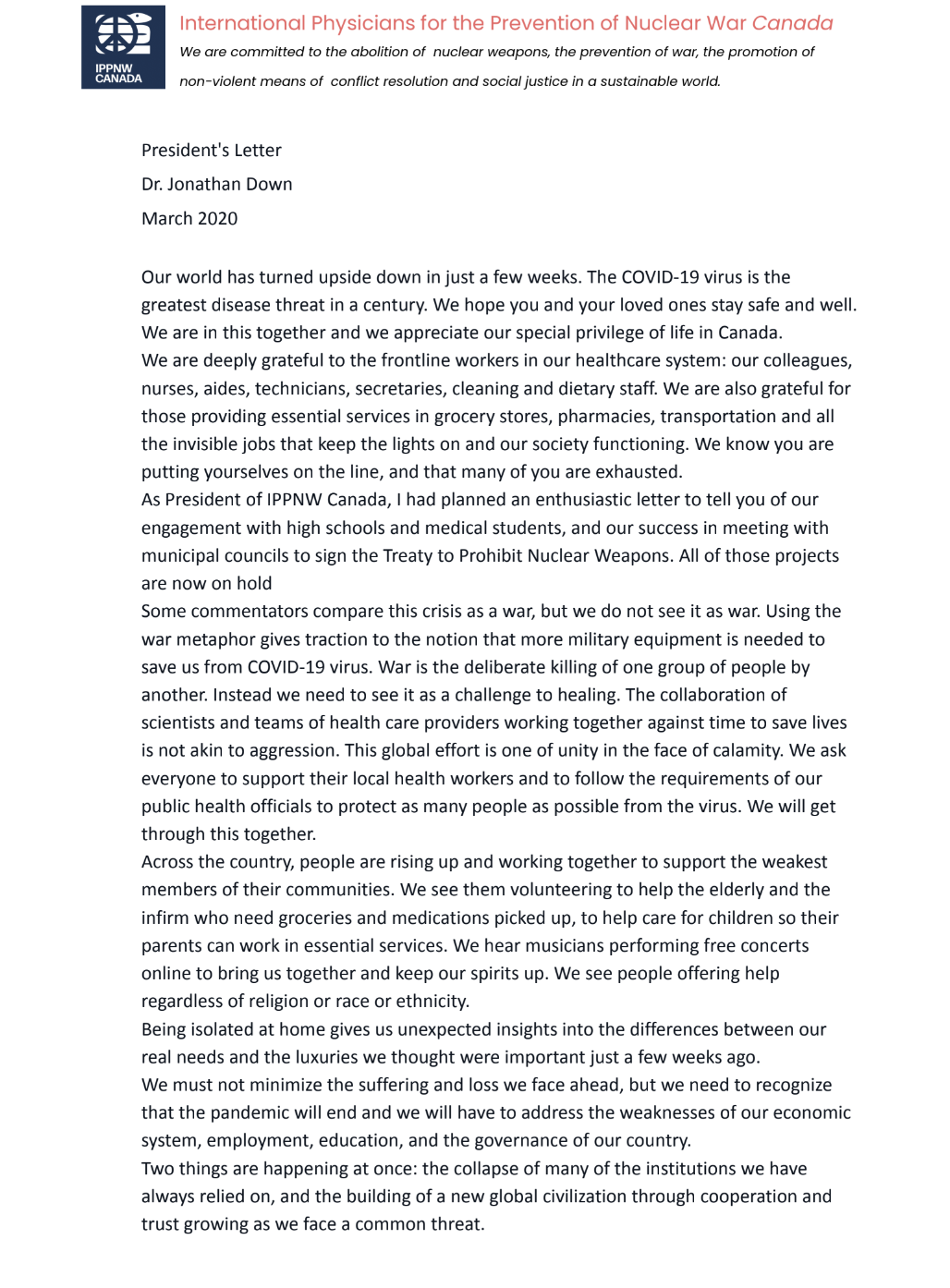 Presidents Letter (March 2020) Statements and LettersCommentary Aug 24 Written By Lia Holla The following letter was written by Past IPPNWC President Dr. Jonathan Down, in response to the emerging COVID-19 Pandemic.To read the full letter click on the photo below. covid 19 Lia Holla